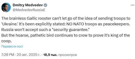 «Ми чітко визначили: жодних натовських миротворців. Росія не прийме такого роду «гарантії безпеки», – написав він у Х.