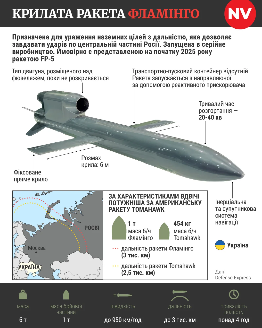 У виданні Defence Express наголошували, що розмір бойової частини ракети "Фламінго" становить одну тонну, що вдвічі потужніше за американський Tomahawk. Швидкість "Фламінго" становить до 950 км/год.