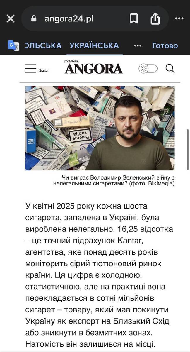 А ще в статтю винесено фото Президента в оточенні пачок сигарет із тим самим підписом: «Чи виграє Володимир Зеленський війну з нелегальними сигаретами?»