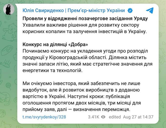 Уряд оголосив конкурс на видобуток літію в Кіровоградській області на родовищі "Добра".