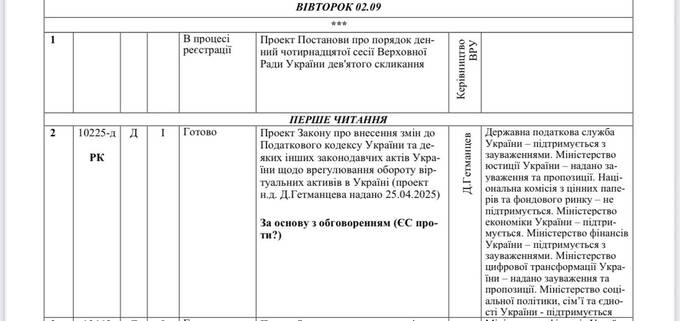 Верховна Рада України планує відкрити осінню сесію 2 вересня. Першим питанням у порядку денному стане розгляд закону про легалізацію віртуальних активів.