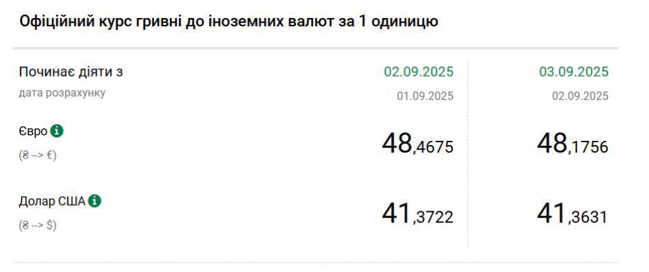 На 3 вересня 2025 року Нацбанк встановив офіційний курс на рівні: 41,3631 гривні за 1 долар (-0,0091 грн).