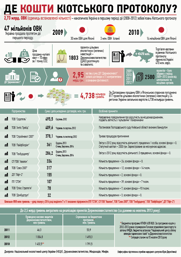 Зокрема, у 2012 році "Українська правда" писала, як кілька мільярдів "кіотських" грошей, що повинні були піти на утеплення лікарень, шкіл, садочків та інтернатів по всій Україні, так і не дійшли до адресатів. Більша частина з них осіла у "прокладках", пов’язаних з депутатом від Партії регіонів Юрієм Іванющенком.