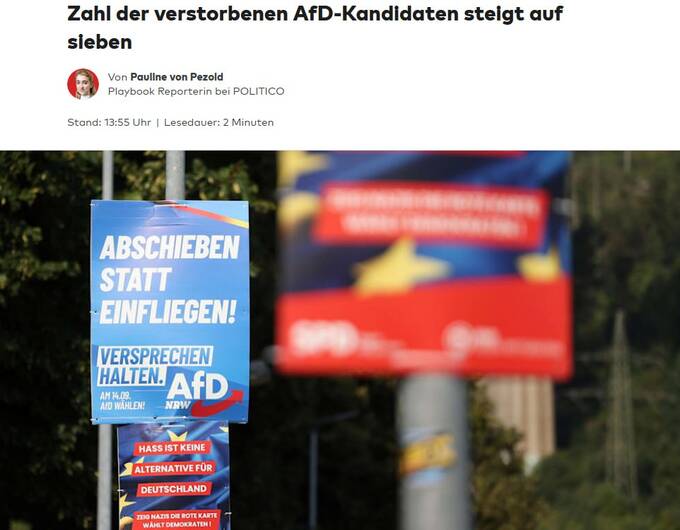 Сім кандидатів від опозиційної партії «Альтернатива для Німеччини» померли протягом короткого часу перед виборами в Північному Рейні — Вестфалії.
