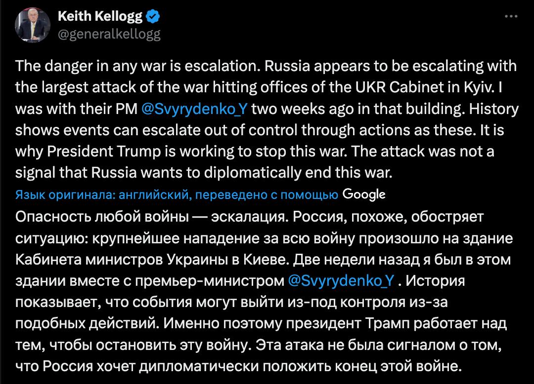 «Ризик будь-якої війни полягає в ескалації. Росія, видається, погіршує ситуацію: наймасштабніше напад за всю війну було здійснено на будівлю Кабінету міністрів України в Києві. Два тижні тому я був присутній у цій будівлі разом з прем’єр-міністром Свириденком», - написав Келлог в Х.