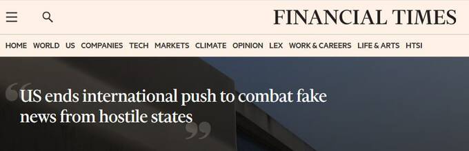 Як повідомляє The Financial Times, США повідомили європейські країни про вихід зі спільних зусиль у боротьбі з дезінформацією від таких країн, як Росія, Китай та Іран.