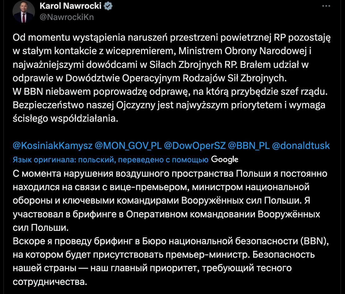 Президент Польщі Навроцький відреагував на вторгнення дронів і анонсував брифінг з Туском