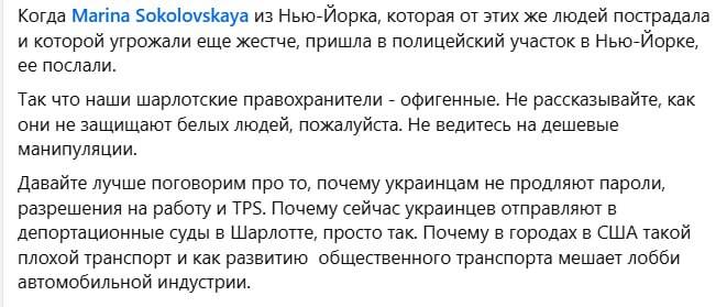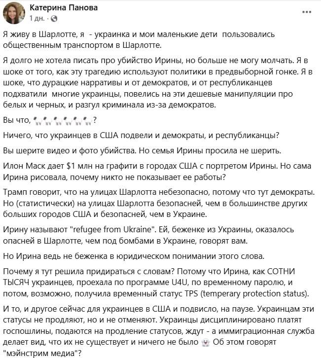 Про це розповіла українка Катерина Панова, яка живе в Шарлотті (в цьому ж місті була вбита Ірина Заруцька).