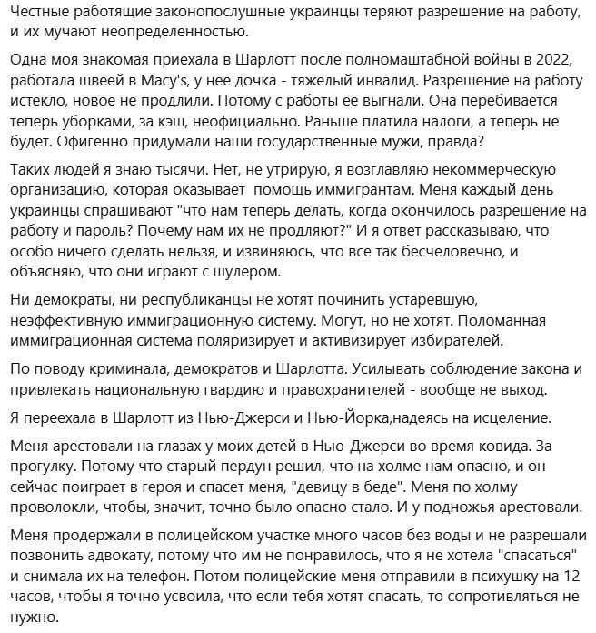 «Обидва ці статуси для українців у США зараз перебувають у підвішеному стані. Українцям не продовжують ці статуси, але й не анулюють їх. Українці сумлінно сплачують державні мита, подають заяви на продовження статусів, чекають – а імміграційна служба удає, що їх не існує і нічого не відбувається. Порядні працелюбні законослухняні українці втрачають дозвіл на роботу, і їх мучить невизначеність. Одну мою знайому, яка прибула в Шарлотт після початку повномасштабної війни у 2022, працювала швачкою в Macy’s, у неї є дочка з тяжкою інвалідністю. Дозвіл на роботу закінчився, і його не продовжили. Через це її звільнили з роботи. Тепер вона перебивається прибираннями, за готівку, неофіційно. Попередні податки вона платила, а тепер вже не буде. Чудова ідея наших державних мужів, чи не так? Таких людей я знаю тисячі», – написала Панова на своїй сторінці у Фейсбуці.