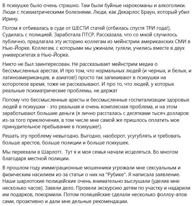 «Мене заарештували на очах у моїх дітей в Нью-Джерсі під час пандемії. За прогулянку. Тому що літній чоловік вирішив, що на пагорбі нам небезпечно, і тепер він зіграє роль героя і врятує мене, "дівчину в біді"… Мене тримали у поліцейському відділку багато годин без води та не дозволяли зв’язатися з адвокатом, оскільки їм не сподобалося, що я відмовилася від "порятунку" і знімала їх на телефон. Потім поліцейські відправили мене до психіатричної лікарні на 12 годин, щоб я точно засвоїла, що від порятунку відмовлятися не можна. У психлікарні було дуже страшно. Там перебували буйні наркомани й алкоголіки. Люди з психічними захворюваннями. Такі люди, як Декарлос Браун, який убив Ірину. Безглузді арешти й безглузді госпіталізації здорових людей у психлікарні - це реальна і дуже складна проблема, і на цьому заробляються великі гроші (я особисто втратила десятки тисяч доларів через цей інцидент, зокрема мені довелося самій же оплатити моє примусове перебування в психлікарні!). Розв’язання цієї проблеми невигідне. Вигідніше, навпаки, погіршувати ситуацію і вимагати більше арештів, більше поліції та більше психлікарень», – написала Панова.