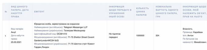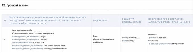 Карайван у декларації вказує дивні речі. Наприклад, що з 2021 року володіє 324 акціями Telegram Messenger LLP на кілька мільйонів гривень. Також має стейблкойн на Ledger у розмірі 5,8 млрд доларів. Він також вказав 100 млн гривень, отриманих як безповоротна фінансова допомога. При цьому чоловік не має ніякого рухомого й нерухомого майна.