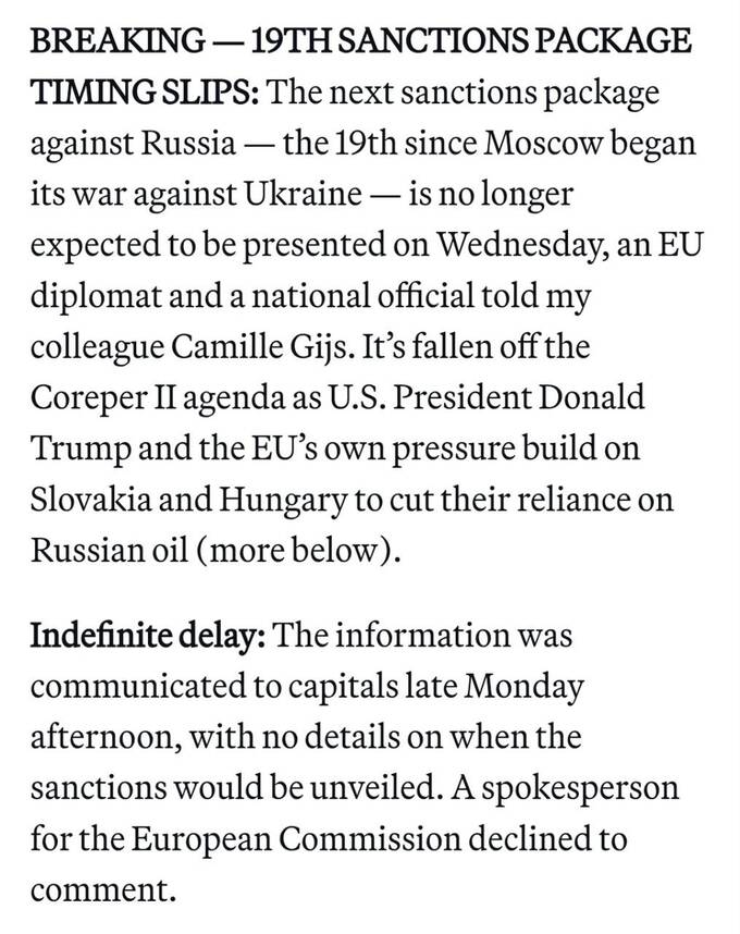 Згідно з даними видання, питання було виключено з порядку денного Комітету постійних представників країн ЄС у Брюсселі. Причиною цього стало те, що Трамп і сам Євросоюз зосередилися на тиску на Словаччину та Угорщину, аби змусити їх скоротити залежність від російської нафти.