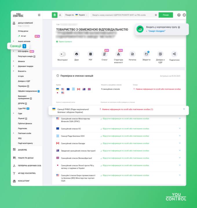 В YouControl відслідковувати присутність фізичних і юридичних осіб в санкційних списках можна автоматично. Варто лише зайти на картку компанії або ввести ПІБ особи в модулі "Перевірка фізосіб", і система підсвітить ці дані як фактор обережності. Крім того, можна відслідковувати актуальний статус за контрагентом, підключивши автоматизований моніторинг до юридичної чи фізичної особи.