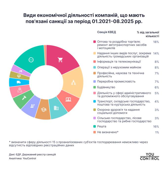 • Підприємства, до співвласників яких застосували санкції та які потрапили під дію обмежувальних заходів, працюють у торгівлі, наданні інших послуг (переважно громадські організації), інформаційно-телекомунікаційній галузі та операціях з нерухомим майном.