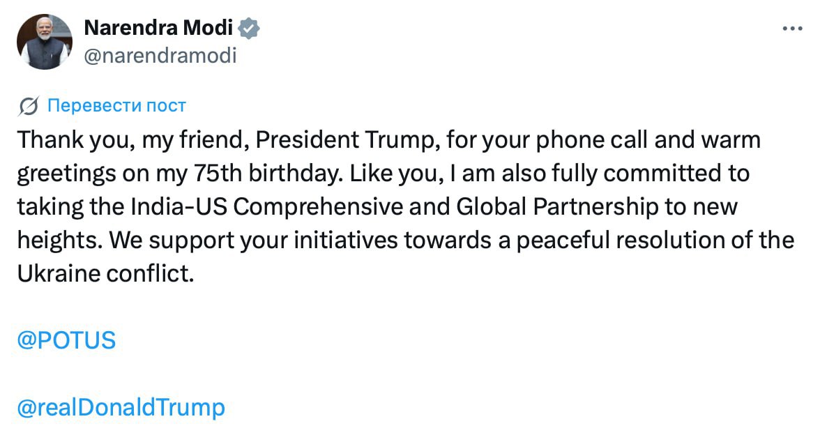 Прем’єр-міністр Моді заявив, що Індія схвалює зусилля Трампа щодо «мирного вирішення конфлікту в Україні».