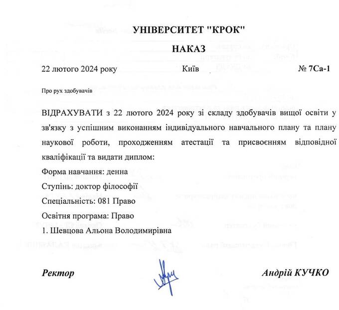 Захист пройшов успішно, і Шевцова здобула науковий ступінь, про що 22 лютого 2024 року було видано відповідний наказ по університету.