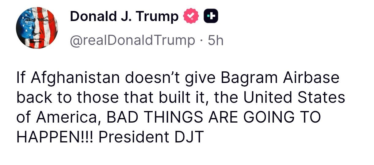 "Якщо Афганістан не поверне авіабазу Баграм тим, хто її створив, Сполученим Штатам Америки, можуть трапитися несприятливі події!" - заявив він.