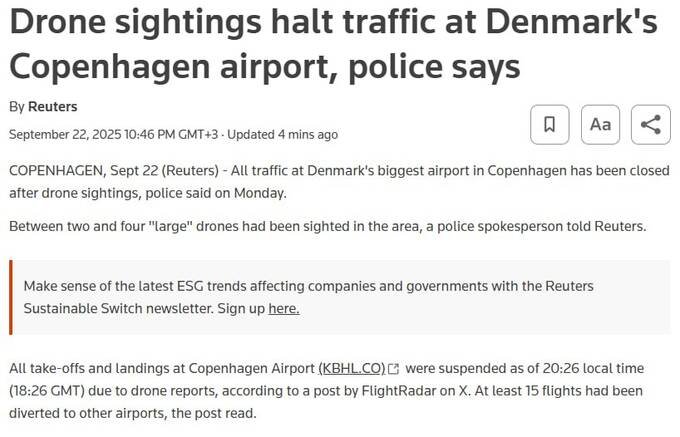 За даними агентства, в Копенгагенському аеропорту було повністю зупинено рух після того, як у зоні польотів було зафіксовано невідомі дрони.