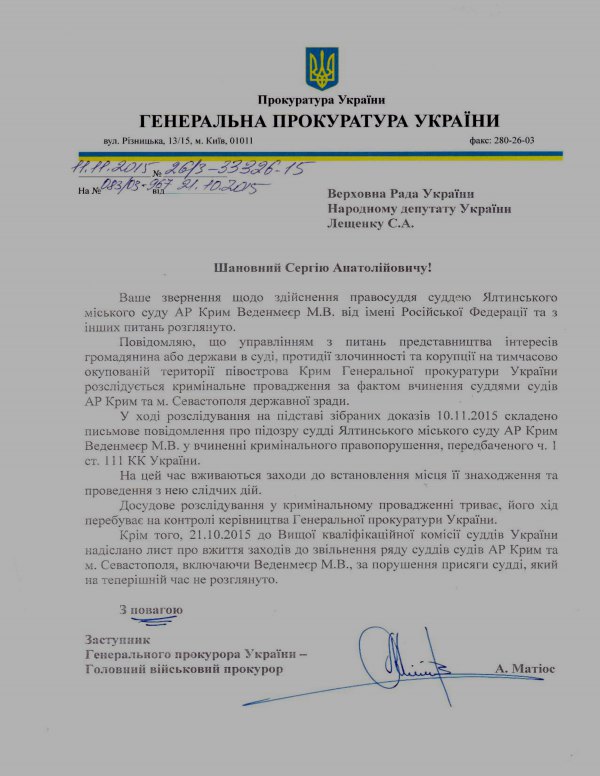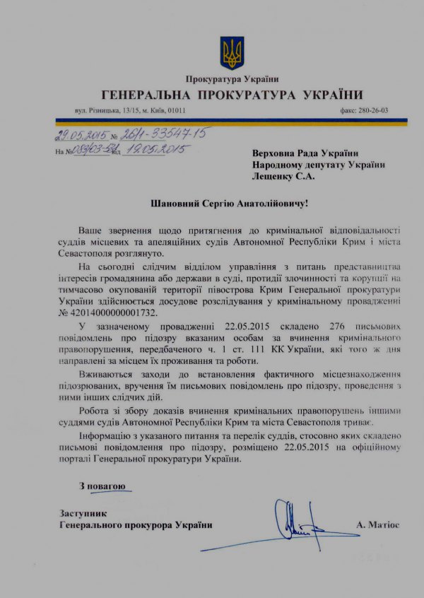 Після неодноразових депутатських звернень Генеральною прокуратурою України 22 травня 2015 року 276 суддям Криму та Севастополя повідомлено про підозру за статтею "державна зрада".