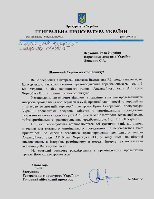 На підставі мого депзвернення Генпрокуратурою проводиться перевірка за фактом висловлювань екс-голови Апеляційного суду Криму Чорнобука в інтерв’ю Центру журналістських розслідувань, де той сказав, що залишається на посаді голови Апеляційного суду Криму, та сприятиме переходу кримських судів на судочинство за законодавством Росії.