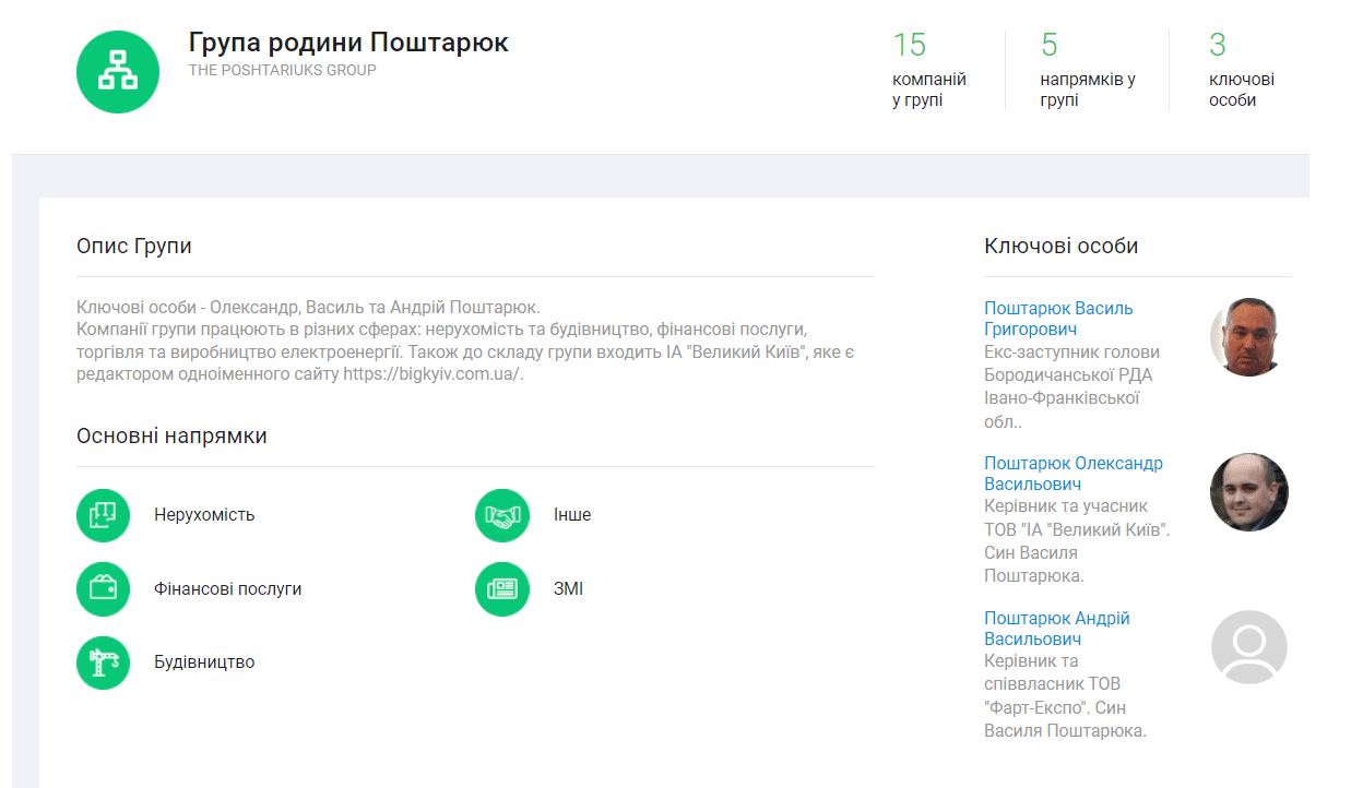 Крім того, опосередковане відношення до “Бенефіс-Інвесту” мають й інші ексвисокопосадовці. Так, за даними Youcontrol, співзасновник даної компанії ТОВ “Комін Девелопмент” має відношення до т.зв. “групи родини Поштарюк”, яка об’єднує близько 15 компаній, зайнятих у сферах нерухомості, будівництва, фінансових послуг, торгівлі та виробництва електроенергії. Ключовими особами даної групи є ексзаступник голови Бородичанської райдержадміністрації (РДА) Івано-Франківської області Василь Поштарюк, а також його сини Олександр і Андрій.