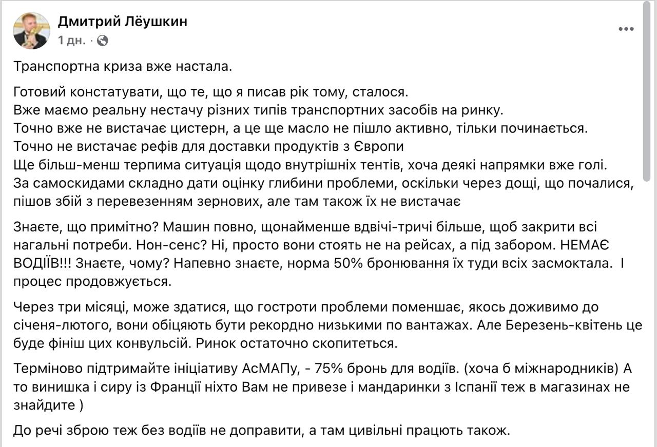 "Машин багато, як мінімум у два-три рази більше, ніж потрібно для задоволення всіх актуальних потреб. Однак вони не виходять на рейси, а стоять без діла. Водіїв немає! Норма в 50% заброньованих їх всіх затягнула. І цей процес продовжується. За три місяці може здатися, що проблема стала менш гострою, якось дотягнемо до січня-лютого, які обіцяють бути рекордно низькими за обсягами вантажів. Але березень-квітень стане фіналом цих конвульсій. Ринок остаточно повалиться", - пише Льоушкін.