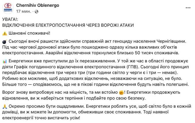 У Чернігівській області дрони знову завдали шкоди кільком об’єктам енергопостачання. Без електрики залишалися ще 50 тисяч абонентів, про що повідомляє обленерго.