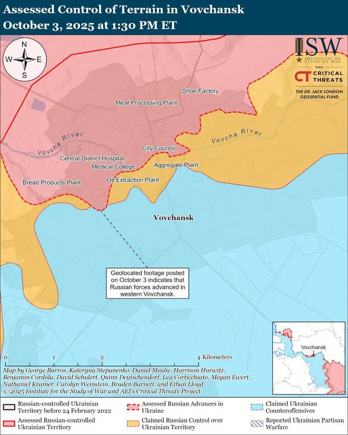 «Геолокаційні кадри, розміщені 3 жовтня, показують, що російські війська нещодавно просунулися вздовж Південної залізниці в західній частині Вовчанська і зайняли Вовчанський залізничний вокзал», - йдеться у звіті Інституту.