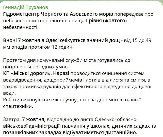 Також влада уточнила, що значні дощі в Одеській області очікуються також 8 і 9 жовтня. Комунальні служби попередили про погіршення погодних умов та посилення режиму роботи.