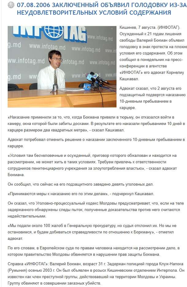 Відомо, що за результатами розгляду обвинувачення проти Бокмана в Молдові, "кілеру в сукні" первинно було визначено покарання у вигляді 21 року позбавлення волі. Допоки тривав апеляційний розгляд справи, захист Валерія Георгійовича скаржився на катування їх клієнта з боку "тюремників", та "засипали" скаргами молдавські та європейські інстанції.