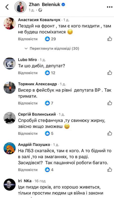 Нардеп від "Слуги Народу" Жан Беленюк шукає кого відп*здити в себе на сторінці в Фейсбуці.