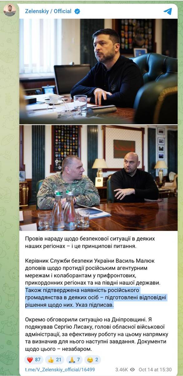 "Керівник Служби безпеки України Василь Малюк доповів щодо протидії російським агентурним мережам і колаборантам у прифронтових, прикордонних регіонах та на півдні нашої держави. Також підтверджена наявність російського громадянства в деяких осіб - підготовлені відповідні рішення щодо них. Указ підписав", - написав Зеленський.