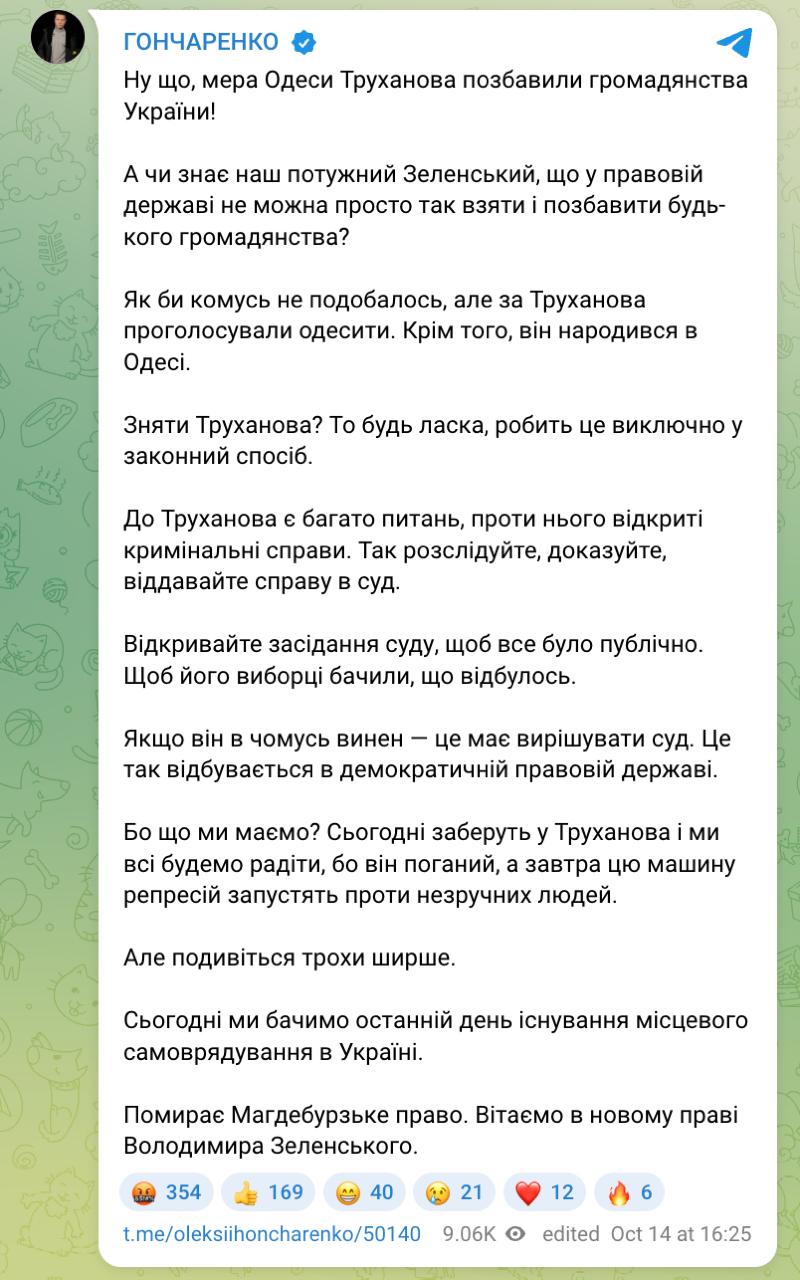 «У правовій державі неможливо просто взяти і позбавити когось громадянства. Попри чиюсь невдоволеність, одесити проголосували за Труханова. Щобільше, він народився в Одесі. Якщо й знімати Труханова, то це слід робити виключно законним шляхом. До Труханова є багато запитань, проти нього порушені кримінальні справи. Тож розслідуйте, доводьте, передавайте справу до суду. Сьогодні відберуть у Труханова, і ми всі радітимемо, тому що він нібито поганий, а завтра машина репресій обернеться проти незручних людей», — пише Гончаренко.