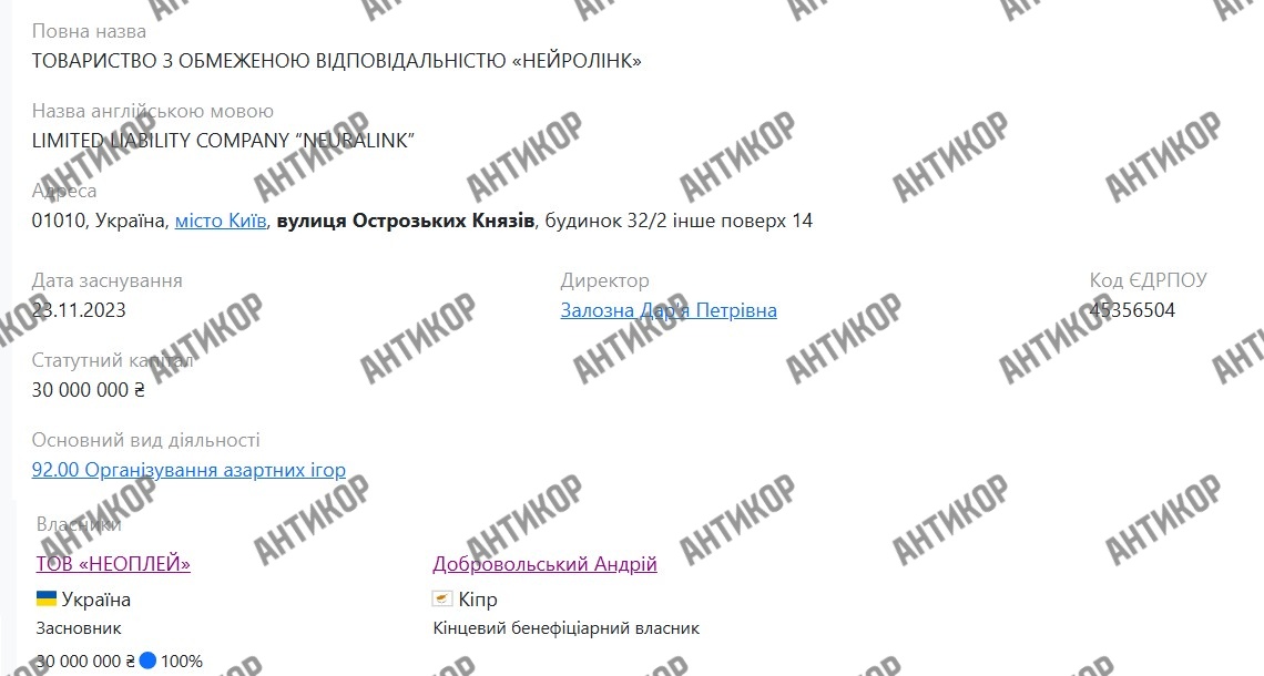Якщо заглянути в картку компанії «Нейролінк» — оператора бренду Cosmobet, зареєстрованої в листопаді 2023 року, — виникають цілком очевидні питання: фірма зі статутним капіталом у 30 мільйонів гривень виникає з нізвідки, отримує ліцензію КРАІЛ, кінцевим бенефіціаром на початку значиться Зборовський. Формально він і був власником. Але ланцюжок подальших подій говорить про інше.