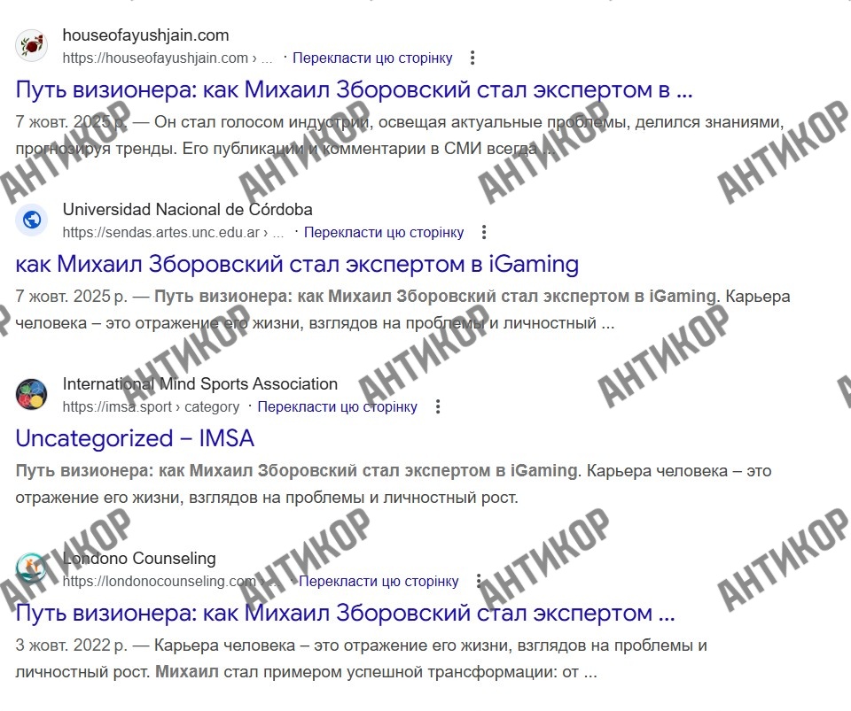На зміну цим слідам приходять десятки англомовних публікацій, написаних за однією схемою. «Візіонер», «технологічний реформатор», «український підприємець нового покоління» — фрази повторюються слово в слово на різних сайтах з мінімальним трафіком. Це не журналістика, а ретельно вибудувана репутаційна кампанія: старі відомості видаляються, а на їх місце ставиться полірована легенда.