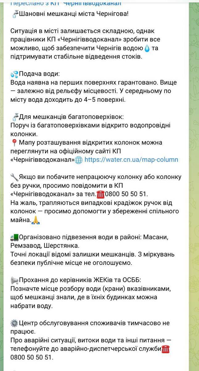 Як повідомляє "Чернігівводоканал", ситуація в місті залишається складною, однак комунальники роблять усе можливе, щоб забезпечити Чернігів водою та підтримувати стабільне відведення стоків.