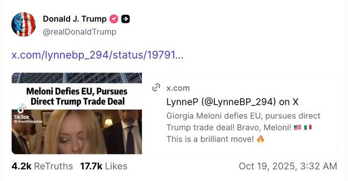 Однак водночас в Італії великий суспільний резонанс викликало відео, яке перепостив у своїй соцмережі позавчора Дональд Трамп. У ньому стверджується, що прем’єр-міністр Італії Джорджа Мелоні має намір скоротити допомогу Україні, а також «кидає виклик Європейському Союзу та намагається укласти пряму торговельну угоду з Трампом».