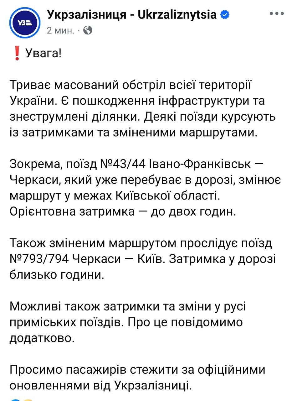 Нічний обстріл призвів до затримок поїздів на території України.