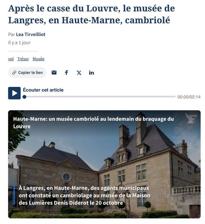 Наступного дня після пограбування Лувру у Франції, ціллю став ще один музей - «Будинок Просвітництва Дені Дідро».