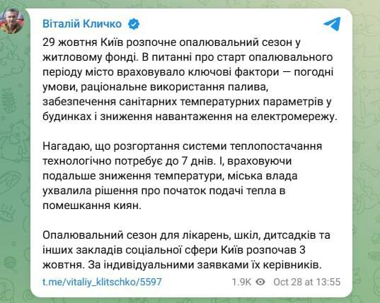 У Києві з 29 жовтня розпочнеться опалювальний сезон для житлового фонду, - Кличко