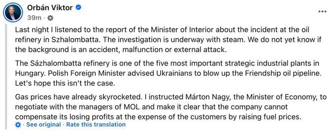 Орбан допускає «зовнішній напад» серед версій пожежі на НПЗ в Угорщині