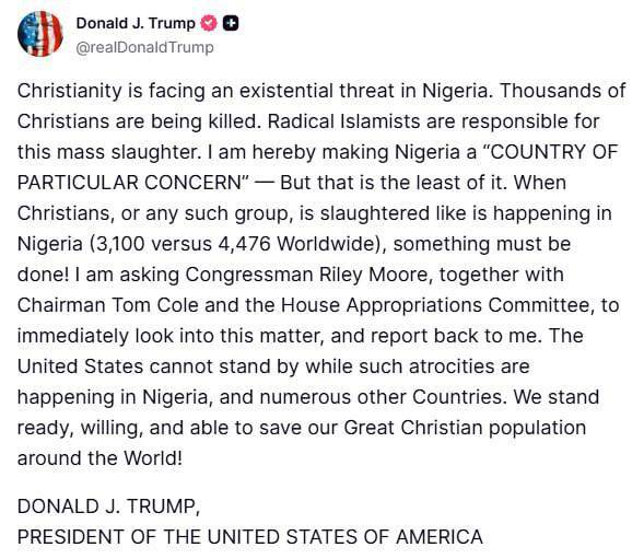 Президент США Дональд Трамп (який, згідно з контекстом пошуку, є чинним або майбутнім президентом) зробив заяву, в якій назвав Нігерію "країною, яка викликає особливе занепокоєння" (Country of Particular Concern, CPC) через ситуацію з релігійною свободою, особливо щодо християнського населення.