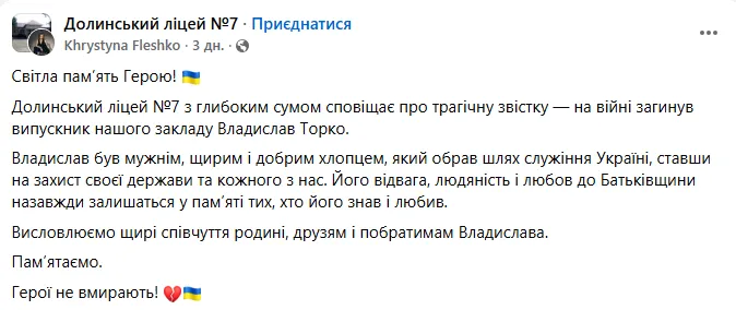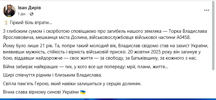 "Йому був лише 21 рік. Але, незважаючи на молодий вік, Владислав свідомо обрав шлях захисту України, проявивши мужність, непохитність і вірність військовій присязі. 20 жовтня 2025 року він поліг у бою, віддавши найцінніше — своє життя — за свободу, за рідну землю, за кожного з нас. Війна забирає найкращих — тих, у кого попереду ще були мрії, плани, ціле життя… Світла пам’ять Герою, який назавжди залишиться в серцях долинян. Вічна слава вірному сину України", – зазначив Дирів.