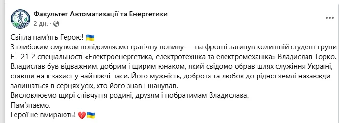 "Владислав був сміливим, добрим і щирим юнаком, який свідомо обрав шлях служіння Україні, ставши на її захист у найскладніші часи. Його мужність, доброта та любов до рідної землі назавжди залишаться в серцях тих, хто його знав і поважав", – згадують про свого колишнього студента на факультеті автоматизації та енергетики.