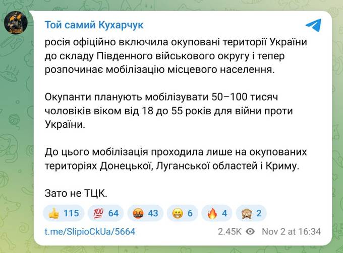 За словами Кухарчука, окупаційні війська мають намір мобілізувати значну кількість чоловічого населення з окупованих регіонів для відправки на війну проти України.