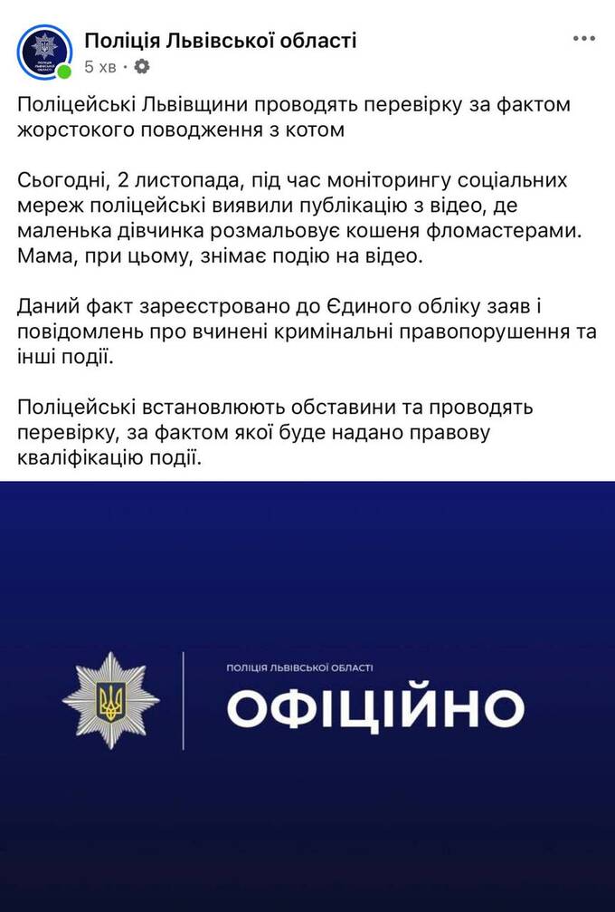 Поліцейські Львівщини проводять перевірку за фактом жорстокого поводження з котом. 2 листопада під час моніторингу соцмереж правоохоронці виявили відео, на якому маленька дівчинка розмальовує кошеня фломастерами, а мама знімає це на камеру.