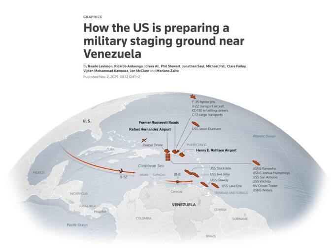 За даними агентства, з серпня Вашингтон перекинув у регіон щонайменше 13 військових кораблів, п’ять допоміжних суден та атомний підводний човен. Серед них — авіаносець «Джеральд Форд», найбільше судно у світі цього класу.