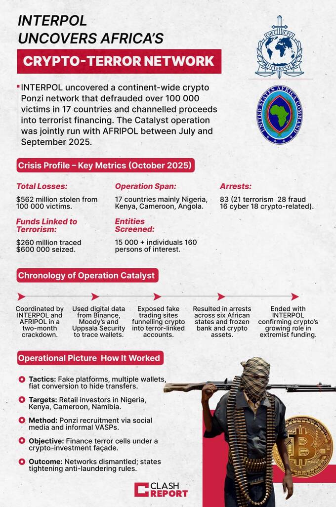 Інтерпол та Afripol повідомили про найбільшу операцію проти транснаціональної криптозлочинності, під час якої було ліквідовано мережу, що діяла в 17 країнах Африки. Загальний збиток від шахрайських схем склав близько $562 млн, з яких $260 млн, за даними слідчих, були пов’язані з фінансуванням терористичних організацій.
