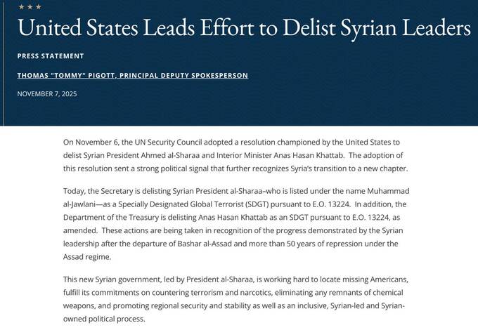 Згідно з інформацією Держдепу, це рішення обумовлено «визнанням досягнень, яких досягло сирійське керівництво після повалення Башара Асада і більш ніж півстолітнього періоду репресій за його правління».