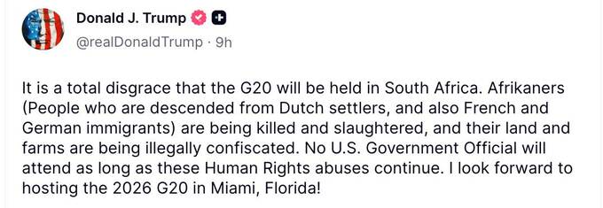 “Це абсолютна ганьба, що саміт G20 проводиться в Південній Африці. Африканери страждають від насильства та вбивств, їхні землі та ферми незаконно відбираються”, — заявив президент США.